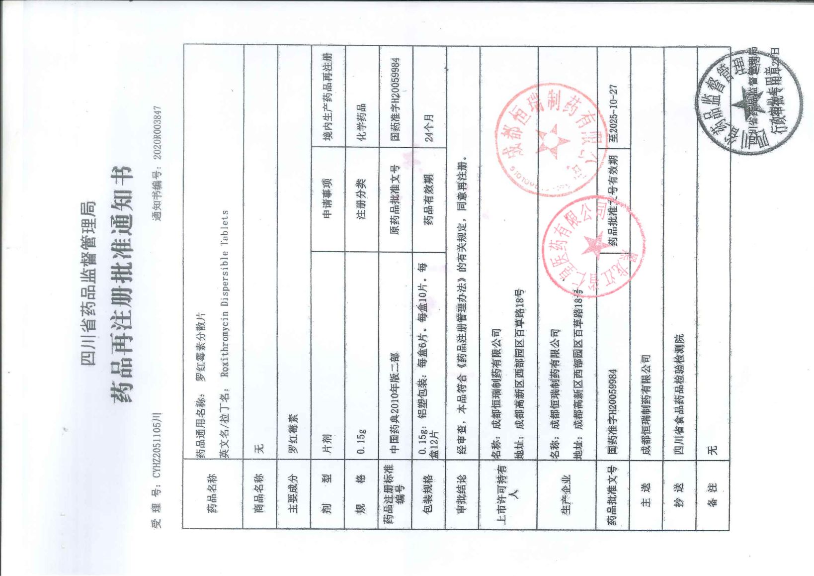 羅紅霉素分散片成都恒