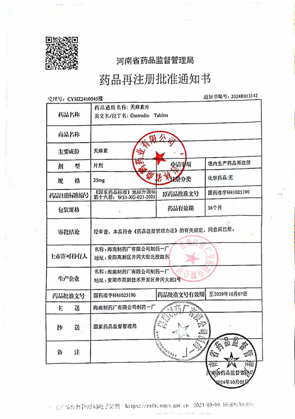 天麻素片海南制藥廠有